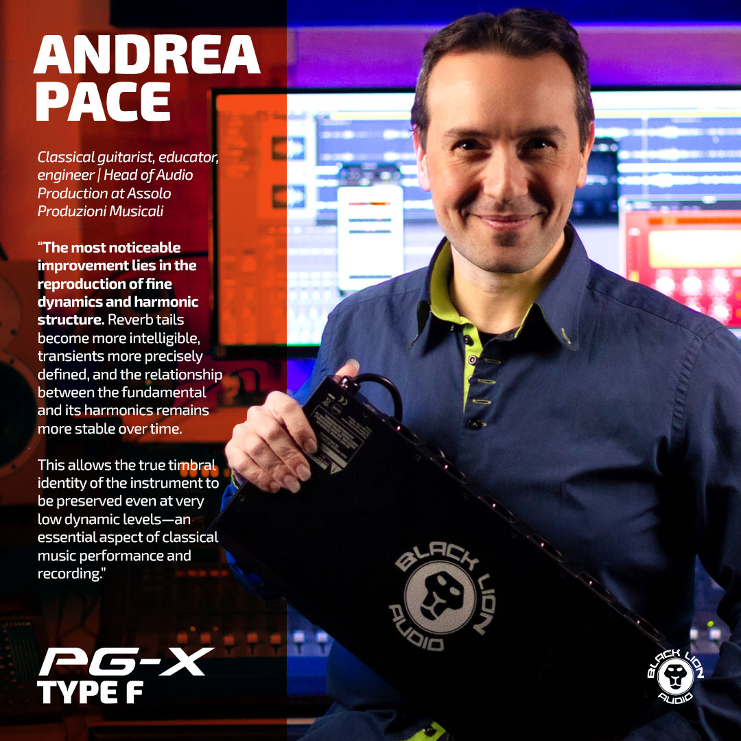 At Assolo Produzioni Musicali, Andrea permanently employs two Black Lion Audio Power Conditioners in the main studio racks, along with a third PG-X installed in a dedicated mobile rack used for location recordings. These sessions often take place in acoustically inspiring but electrically challenging environments such as churches and concert halls. Integrating the PG-X into the power distribution system has resulted in a clear and measurable improvement in overall system stability. Their ability to effectively suppress voltage spikes, impulsive noise, and switching residuals, while significantly reducing common-mode disturbances, provides a cleaner and more controlled power supply to all connected equipment. This directly translates into more linear and predictable behavior from audio devices, particularly microphone preamplifiers and converters.