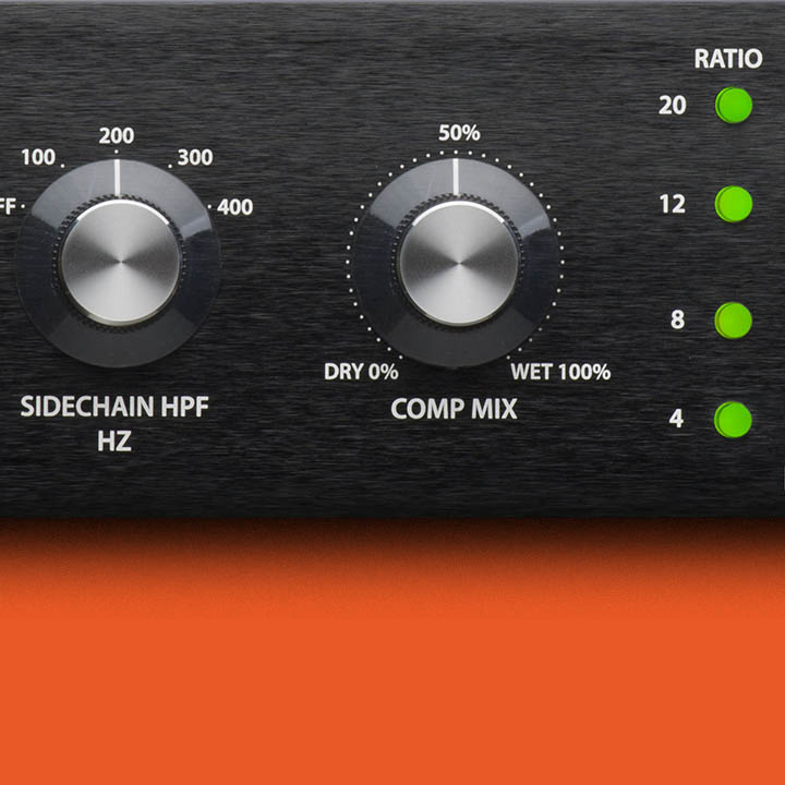 ControlsAttack*, Release, Comp Mix, Input, Output, HPF/LPF switches